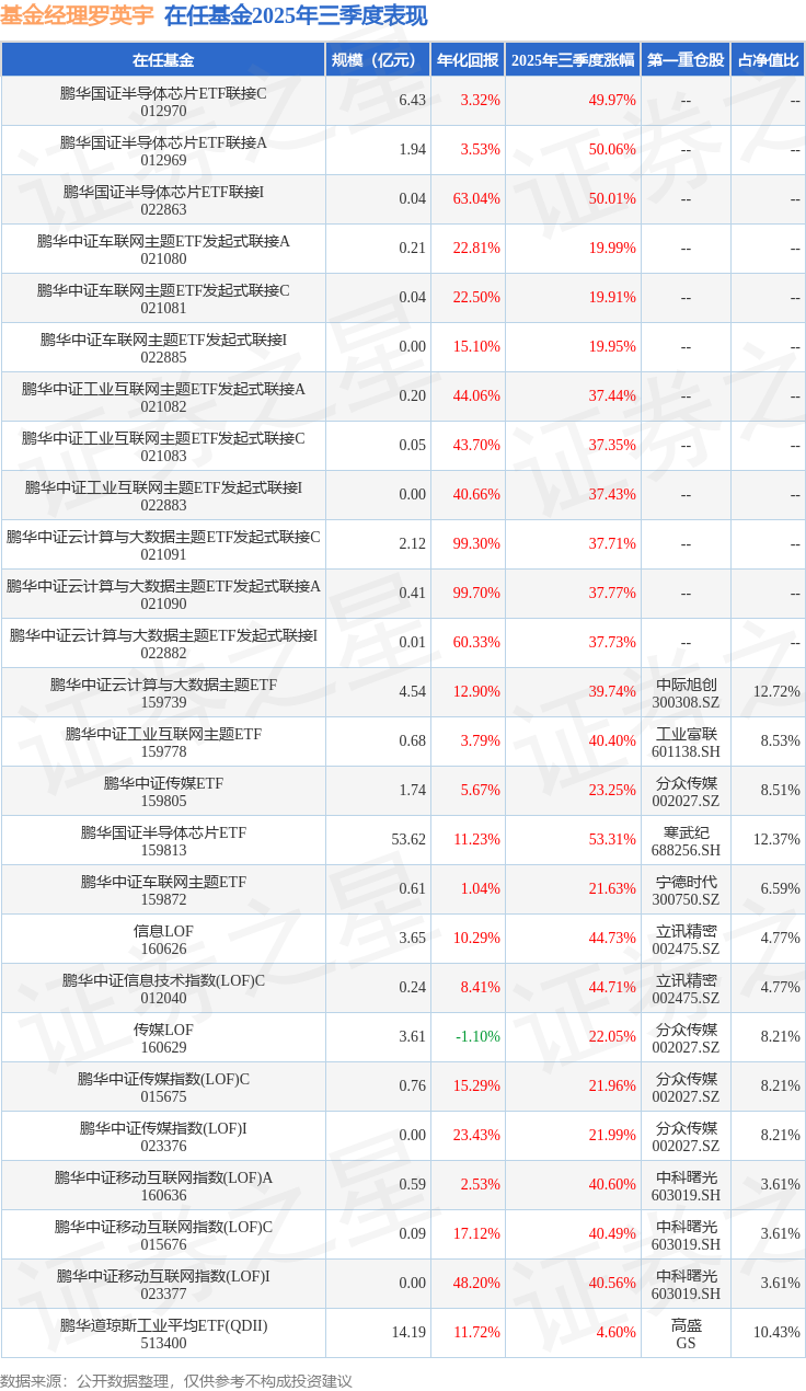 鹏华道琼斯工业平均ETF(QDII)现任基金经理为罗英宇 李悦。其中在任基金经理罗英宇已从业4年又312天,2024年1月17日正式接手管理鹏华道琼斯工业平均ETF(QDII),任职期间累计回报为21.78%。目前还管理着26只基金产品(包括A类和C类),其中本季度表现最佳的基金为鹏华国证半导体芯片ETF(159813),季度净值涨幅为53.31%。