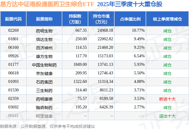 证券之星消息,日前易方达中证港股通医药卫生综合ETF基金公布三季报,2025年三季度最新规模23.19亿元,季度净值涨幅为32.74%。