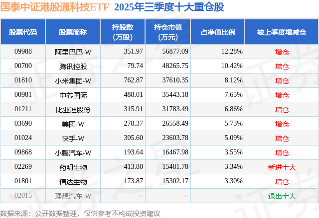 从基金规模来看,国泰中证港股通科技ETF基金2025年三季度公布的基金规模为46.33亿元,较上一期规模12.84亿元变化了33.49亿元,环比变化了260.76%。该基金最新一期资产配置为:股票占净值比99.77%,无债券类资产,现金占净值比2.88%。从基金持仓来看,该基金当季前十大股票仓位达66.34%,第一大重仓股为阿里巴巴-W(09988),持仓占比为12.28%。