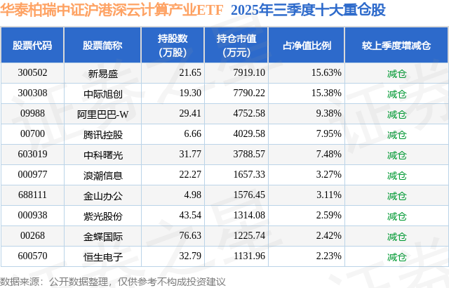 从基金规模来看,华泰柏瑞中证沪港深云计算产业ETF基金2025年三季度公布的基金规模为5.07亿元,较上一期规模5.7亿元变化了-6314.35万元,环比变化了-11.08%。该基金最新一期资产配置为:股票占净值比98.71%,无债券类资产,现金占净值比1.49%。从基金持仓来看,该基金当季前十大股票仓位达69.44%,第一大重仓股为新易盛(300502),持仓占比为15.63%。