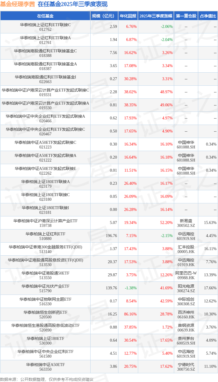 华泰柏瑞中证沪港深云计算产业ETF现任基金经理为李茜。其中在任基金经理李茜已从业5年又360天,2022年1月18日正式接手管理华泰柏瑞中证沪港深云计算产业ETF,任职期间累计回报为95.01%。目前还管理着27只基金产品(包括A类和C类),其中本季度表现最佳的基金为华泰柏瑞中证沪港深云计算产业ETF(159738),季度净值涨幅为52.2%。