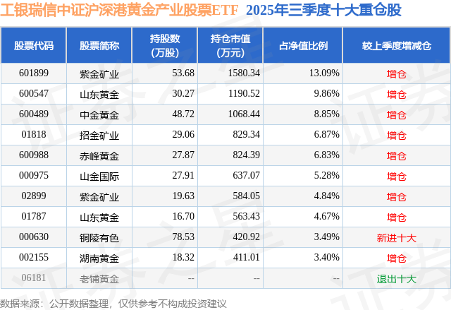 从基金规模来看,工银瑞信中证沪深港黄金产业股票ETF基金2025年三季度公布的基金规模为1.21亿元,较上一期规模4873.35万元变化了7202.47万元,环比变化了147.79%。该基金最新一期资产配置为:股票占净值比98.48%,无债券类资产,现金占净值比1.54%。从基金持仓来看,该基金当季前十大股票仓位达67.18%,第一大重仓股为紫金矿业(601899),持仓占比为13.09%。