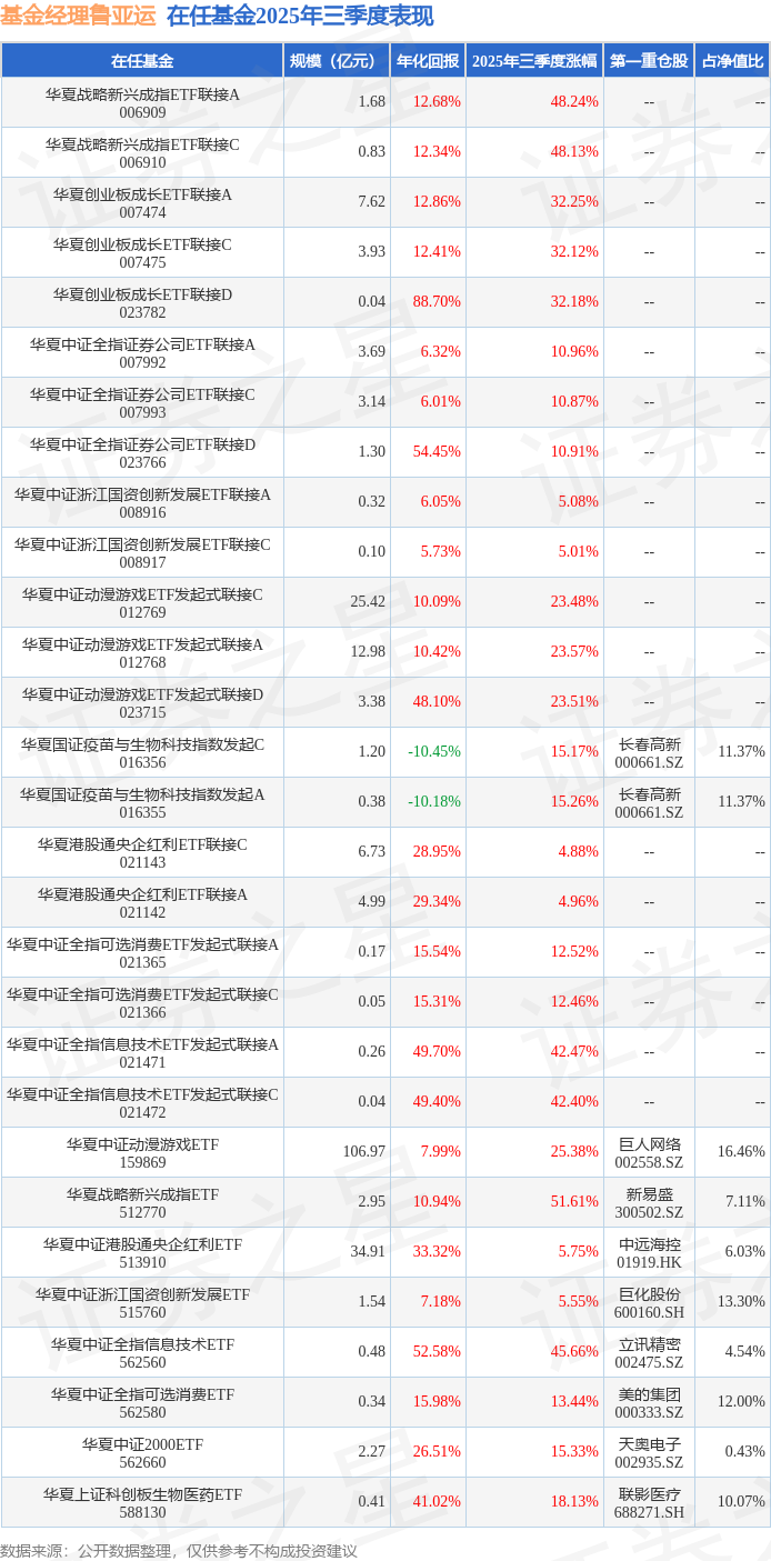 华夏中证全指信息技术ETF现任基金经理为鲁亚运。其中在任基金经理鲁亚运已从业3年又142天,2024年3月27日正式接手管理华夏中证全指信息技术ETF,任职期间累计回报为95.7%。目前还管理着29只基金产品(包括A类和C类),其中本季度表现最佳的基金为华夏战略新兴成指ETF(512770),季度净值涨幅为51.61%。