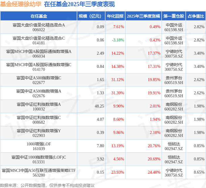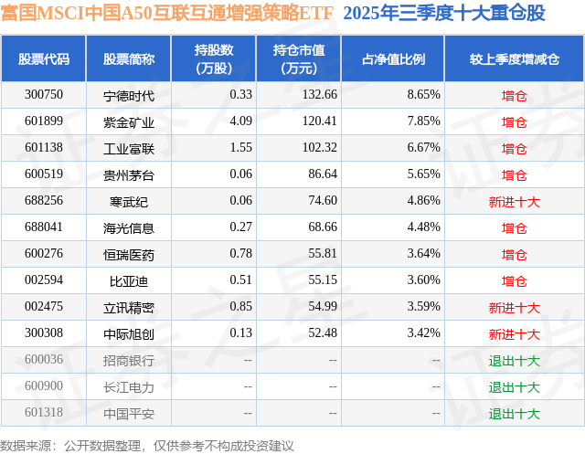 从基金规模来看,富国MSCI中国A50互联互通增强策略ETF基金2025年三季度公布的基金规模为0.15亿元,较上一期规模902.82万元变化了630.86万元,环比变化了69.88%。该基金最新一期资产配置为:股票占净值比98.97%,无债券类资产,现金占净值比0.56%。从基金持仓来看,该基金当季前十大股票仓位达52.41%,第一大重仓股为宁德时代(300750),持仓占比为8.65%。