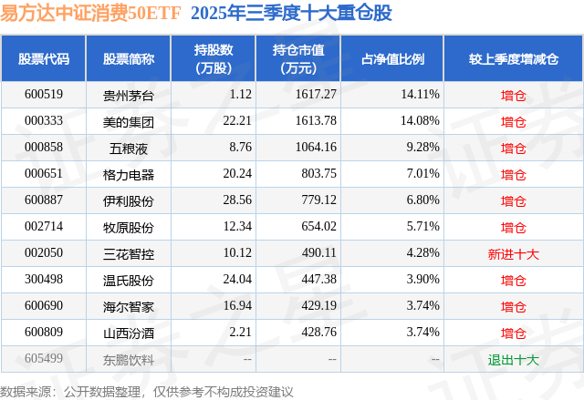 从基金规模来看,易方达中证消费50ETF基金2025年三季度公布的基金规模为1.15亿元,较上一期规模7900.19万元变化了3561.64万元,环比变化了45.08%。该基金最新一期资产配置为:股票占净值比99.29%,无债券类资产,现金占净值比0.85%。从基金持仓来看,该基金当季前十大股票仓位达72.65%,第一大重仓股为贵州茅台(600519),持仓占比为14.11%。