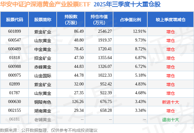 从基金规模来看,华安中证沪深港黄金产业股票ETF基金2025年三季度公布的基金规模为1.97亿元,较上一期规模1.13亿元变化了8468.48万元,环比变化了75.25%。该基金最新一期资产配置为:股票占净值比97.28%,无债券类资产,现金占净值比5.36%。从基金持仓来看,该基金当季前十大股票仓位达66.41%,第一大重仓股为紫金矿业(601899),持仓占比为12.91%。