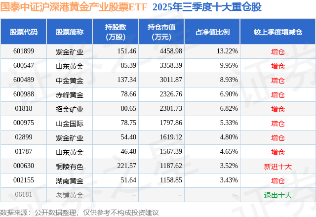 从基金规模来看,国泰中证沪深港黄金产业股票ETF基金2025年三季度公布的基金规模为3.37亿元,较上一期规模1.56亿元变化了1.82亿元,环比变化了116.73%。该基金最新一期资产配置为:股票占净值比99.09%,无债券类资产,现金占净值比3.18%。从基金持仓来看,该基金当季前十大股票仓位达67.55%,第一大重仓股为紫金矿业(601899),持仓占比为13.22%。