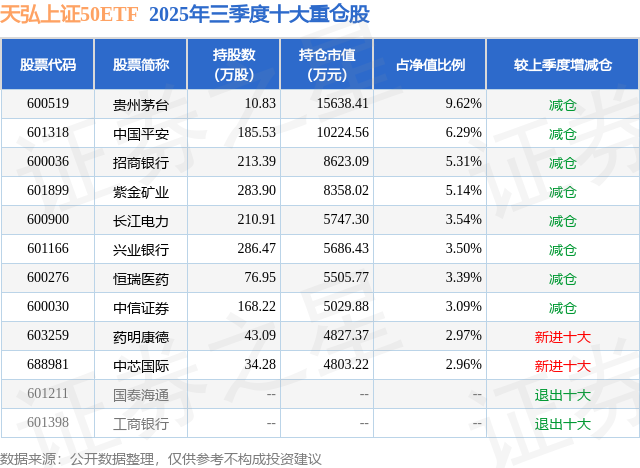 从基金规模来看,天弘上证50ETF基金2025年三季度公布的基金规模为16.25亿元,较上一期规模17.8亿元变化了-1.55亿元,环比变化了-8.7%。该基金最新一期资产配置为:股票占净值比97.72%,无债券类资产,现金占净值比2.08%。从基金持仓来看,该基金当季前十大股票仓位达45.81%,第一大重仓股为贵州茅台(600519),持仓占比为9.62%。