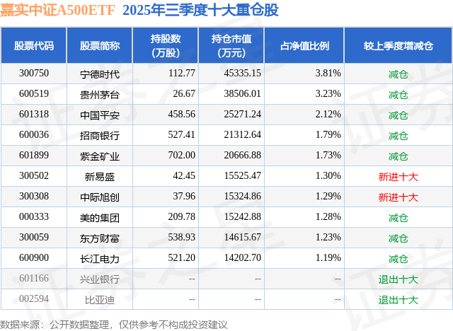 从基金规模来看,嘉实中证A500ETF基金2025年三季度公布的基金规模为119.13亿元,较上一期规模177.83亿元变化了-58.7亿元,环比变化了-33.01%。该基金最新一期资产配置为:股票占净值比99.86%,无债券类资产,现金占净值比0.52%。从基金持仓来看,该基金当季前十大股票仓位达18.97%,第一大重仓股为宁德时代(300750),持仓占比为3.81%。