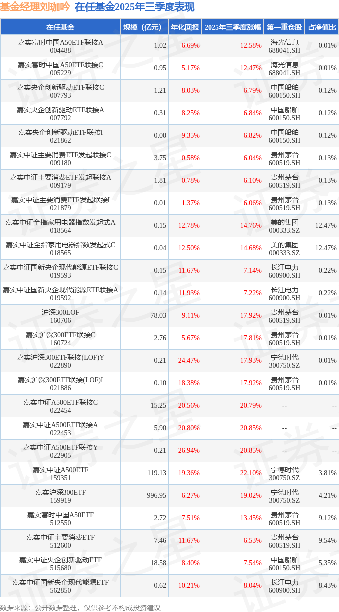 嘉实中证A500ETF现任基金经理为刘珈吟 张超梁。其中在任基金经理刘珈吟已从业9年又221天,2024年9月20日正式接手管理嘉实中证A500ETF,任职期间累计回报为21.57%。目前还管理着25只基金产品(包括A类和C类),其中本季度表现最佳的基金为嘉实中证A500ETF(159351),季度净值涨幅为22.1%。