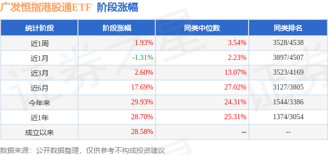 从业绩表现来看,广发恒指港股通ETF基金过去一年净值涨幅为28.7%,在同类基金中排名1374/3054,同类基金过去一年净值涨幅中位数为25.31%。而基金过去一年的最大回撤为-19.25%,成立以来的最大回撤为-19.25%。