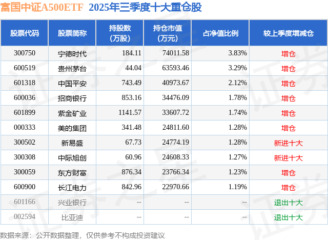 从基金规模来看,富国中证A500ETF基金2025年三季度公布的基金规模为193.3亿元,较上一期规模139.9亿元变化了53.4亿元,环比变化了38.17%。该基金最新一期资产配置为:股票占净值比99.82%,无债券类资产,现金占净值比0.69%。从基金持仓来看,该基金当季前十大股票仓位达19.01%,第一大重仓股为宁德时代(300750),持仓占比为3.83%。