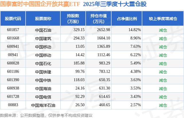 从基金规模来看,国泰富时中国国企开放共赢ETF基金2025年三季度公布的基金规模为1.79亿元,较上一期规模2.56亿元变化了-7714.35万元,环比变化了-30.12%。该基金最新一期资产配置为:股票占净值比98.42%,无债券类资产,现金占净值比1.64%。从基金持仓来看,该基金当季前十大股票仓位达60.66%,第一大重仓股为中国石油(601857),持仓占比为14.82%。