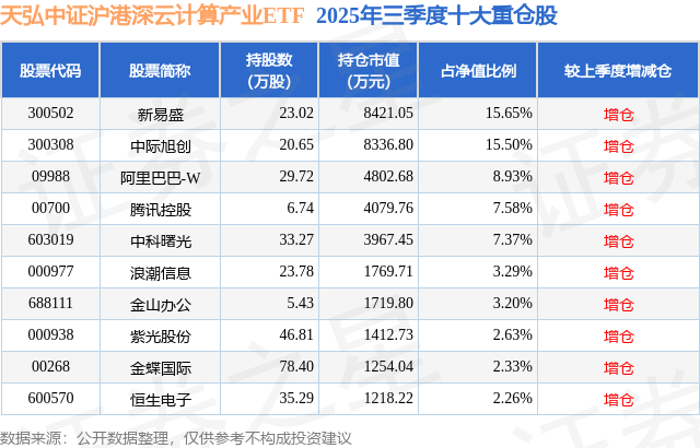 从基金规模来看,天弘中证沪港深云计算产业ETF基金2025年三季度公布的基金规模为5.38亿元,较上一期规模2.99亿元变化了2.39亿元,环比变化了80.02%。该基金最新一期资产配置为:股票占净值比98.24%,无债券类资产,现金占净值比0.83%。从基金持仓来看,该基金当季前十大股票仓位达68.74%,第一大重仓股为新易盛(300502),持仓占比为15.65%。