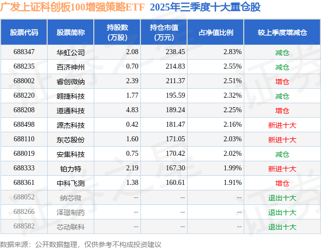 从基金规模来看,广发上证科创板100增强策略ETF基金2025年三季度公布的基金规模为0.84亿元,较上一期规模6648.26万元变化了1770.66万元,环比变化了26.63%。该基金最新一期资产配置为:股票占净值比95.46%,无债券类资产,现金占净值比4.78%。从基金持仓来看,该基金当季前十大股票仓位达22.57%,第一大重仓股为华虹公司(688347),持仓占比为2.83%。