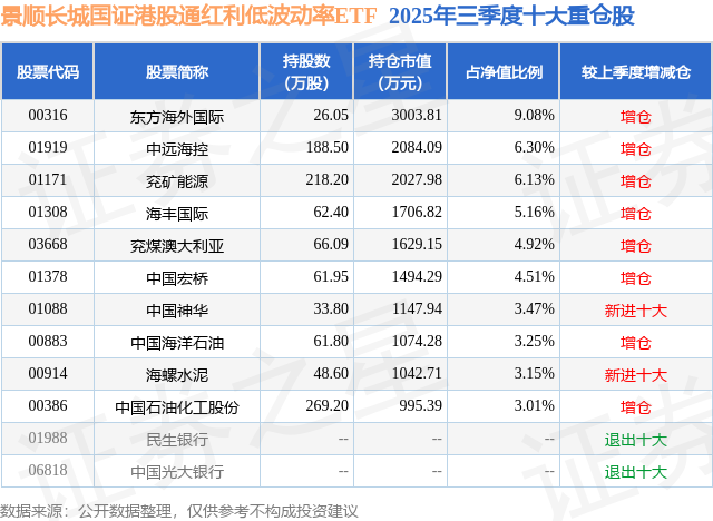 从基金规模来看,景顺长城国证港股通红利低波动率ETF基金2025年三季度公布的基金规模为3.31亿元,较上一期规模1.68亿元变化了1.63亿元,环比变化了96.64%。该基金最新一期资产配置为:股票占净值比97.02%,无债券类资产,现金占净值比2.29%。从基金持仓来看,该基金当季前十大股票仓位达48.98%,第一大重仓股为东方海外国际(00316),持仓占比为9.08%。