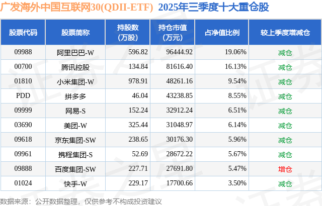 从基金规模来看,广发海外中国互联网30(QDII-ETF)基金2025年三季度公布的基金规模为50.59亿元,较上一期规模44.21亿元变化了6.38亿元,环比变化了14.44%。该基金最新一期资产配置为:股票占净值比84.26%,无债券类资产,现金占净值比0.71%。从基金持仓来看,该基金当季前十大股票仓位达86.53%,第一大重仓股为阿里巴巴-W(09988),持仓占比为19.06%。