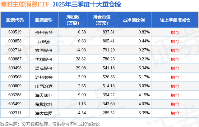 从基金规模来看,博时主要消费ETF基金2025年三季度公布的基金规模为0.85亿元,较上一期规模7362.12万元变化了1170.63万元,环比变化了15.9%。该基金最新一期资产配置为:股票占净值比98.76%,无债券类资产,现金占净值比1.53%。从基金持仓来看,该基金当季前十大股票仓位达67.85%,第一大重仓股为贵州茅台(600519),持仓占比为9.82%。
