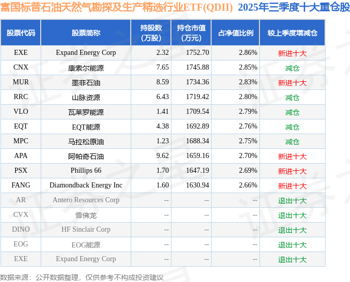 从基金规模来看,富国标普石油天然气勘探及生产精选行业ETF(QDII)基金2025年三季度公布的基金规模为6.13亿元,较上一期规模6.61亿元变化了-4788.68万元,环比变化了-7.24%。该基金最新一期资产配置为:股票占净值比99.83%,无债券类资产,现金占净值比0.56%。从基金持仓来看,该基金当季前十大股票仓位达27.69%,第一大重仓股为Expand Energy Corp(EXE),持仓占比为2.86%。