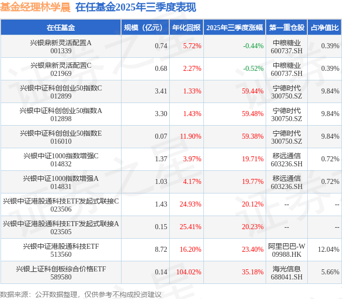 兴银中证港股通科技ETF现任基金经理为林学晨。其中在任基金经理林学晨已从业4年又106天,2024年3月5日正式接手管理兴银中证港股通科技ETF,任职期间累计回报为99.79%。目前还管理着11只基金产品(包括A类和C类),其中本季度表现最佳的基金为兴银中证科创创业50指数A(012898),季度净值涨幅为59.48%。