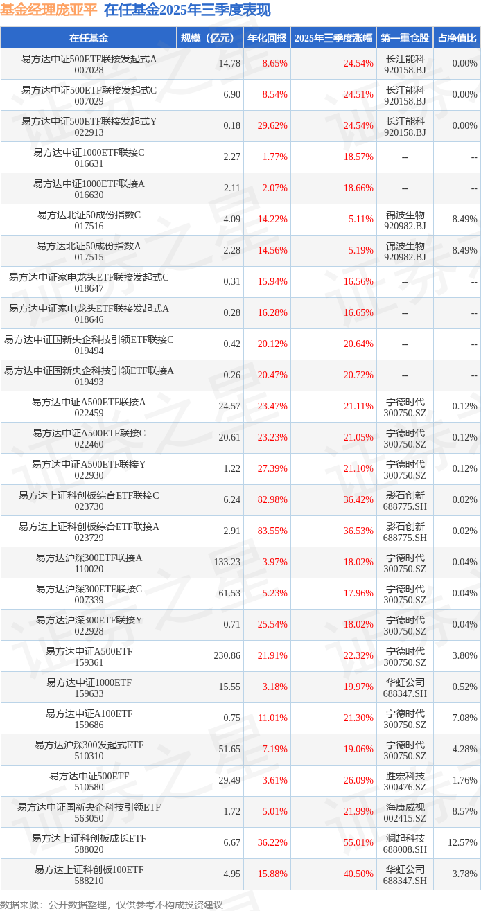 易方达上证科创板100ETF现任基金经理为庞亚平。其中在任基金经理庞亚平已从业5年又132天,2023年11月8日正式接手管理易方达上证科创板100ETF,任职期间累计回报为33.74%。目前还管理着27只基金产品(包括A类和C类),其中本季度表现最佳的基金为易方达上证科创板成长ETF(588020),季度净值涨幅为55.01%。
