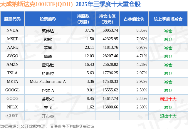 证券之星消息,日前大成纳斯达克100ETF(QDII)基金公布三季报,2025年三季度最新规模59.95亿元,季度净值涨幅为7.71%。