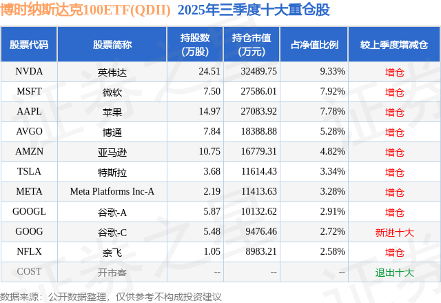 从基金规模来看,博时纳斯达克100ETF(QDII)基金2025年三季度公布的基金规模为34.82亿元,较上一期规模30.69亿元变化了4.13亿元,环比变化了13.45%。该基金最新一期资产配置为:股票占净值比93.22%,无债券类资产,现金占净值比6.03%。从基金持仓来看,该基金当季前十大股票仓位达49.96%,第一大重仓股为英伟达(NVDA),持仓占比为9.33%。