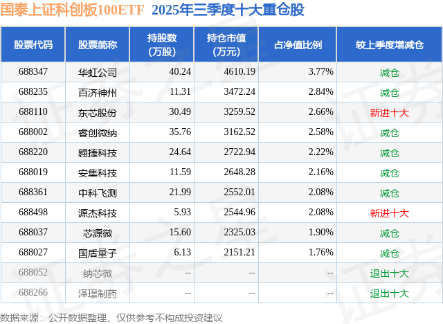 从基金规模来看,国泰上证科创板100ETF基金2025年三季度公布的基金规模为12.24亿元,较上一期规模9.82亿元变化了2.42亿元,环比变化了24.63%。该基金最新一期资产配置为:股票占净值比99.06%,无债券类资产,现金占净值比1.07%。从基金持仓来看,该基金当季前十大股票仓位达24.05%,第一大重仓股为华虹公司(688347),持仓占比为3.77%。