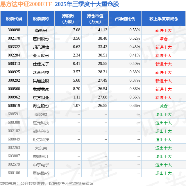 从基金规模来看,易方达中证2000ETF基金2025年三季度公布的基金规模为0.75亿元,较上一期规模5808.43万元变化了1661.12万元,环比变化了28.6%。该基金最新一期资产配置为:股票占净值比94.87%,无债券类资产,现金占净值比4.98%。从基金持仓来看,该基金当季前十大股票仓位达4.16%,第一大重仓股为高新兴(300098),持仓占比为0.55%。