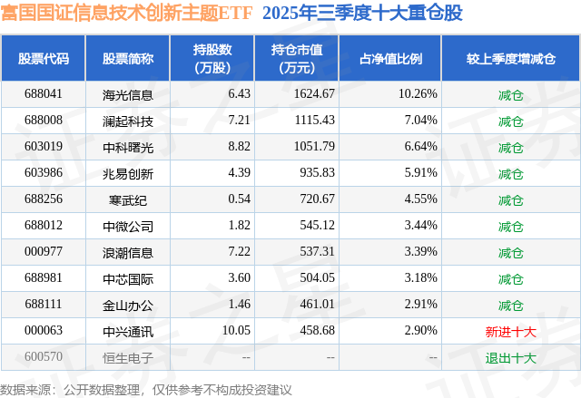 从基金规模来看,富国国证信息技术创新主题ETF基金2025年三季度公布的基金规模为1.58亿元,较上一期规模2.42亿元变化了-8334.44万元,环比变化了-34.48%。该基金最新一期资产配置为:股票占净值比98.84%,无债券类资产,现金占净值比0.57%。从基金持仓来看,该基金当季前十大股票仓位达50.22%,第一大重仓股为海光信息(688041),持仓占比为10.26%。