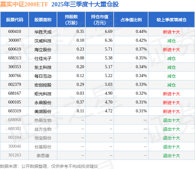 从基金规模来看,嘉实中证2000ETF基金2025年三季度公布的基金规模为0.15亿元,较上一期规模2057.67万元变化了-531.88万元,环比变化了-25.85%。该基金最新一期资产配置为:股票占净值比95.7%,无债券类资产,现金占净值比4.27%。从基金持仓来看,该基金当季前十大股票仓位达3.53%,第一大重仓股为华胜天成(600410),持仓占比为0.44%。