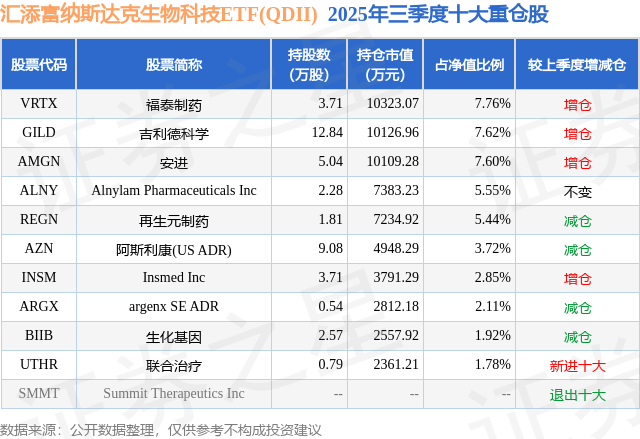 从基金规模来看,汇添富纳斯达克生物科技ETF(QDII)基金2025年三季度公布的基金规模为13.3亿元,较上一期规模12.76亿元变化了5351.12万元,环比变化了4.19%。该基金最新一期资产配置为:股票占净值比87.09%,无债券类资产,现金占净值比0.75%。从基金持仓来看,该基金当季前十大股票仓位达46.35%,第一大重仓股为福泰制药(VRTX),持仓占比为7.76%。