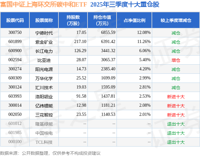 从基金规模来看,富国中证上海环交所碳中和ETF基金2025年三季度公布的基金规模为5.68亿元,较上一期规模6.31亿元变化了-6346.64万元,环比变化了-10.06%。该基金最新一期资产配置为:股票占净值比99.7%,无债券类资产,现金占净值比0.75%。从基金持仓来看,该基金当季前十大股票仓位达51.42%,第一大重仓股为宁德时代(300750),持仓占比为12.08%。