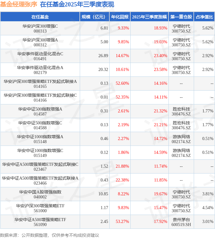 从基金规模来看,华安沪深300增强策略ETF基金2025年三季度公布的基金规模为1.17亿元,较上一期规模1.24亿元变化了-685.02万元,环比变化了-5.54%。该基金最新一期资产配置为:股票占净值比89.31%,无债券类资产,现金占净值比9.7%。从基金持仓来看,该基金当季前十大股票仓位达25.76%,第一大重仓股为宁德时代(300750),持仓占比为4.54%。