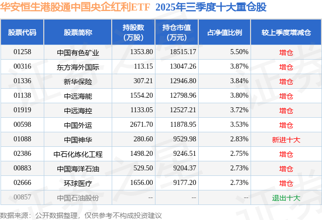 从基金规模来看,华安恒生港股通中国央企红利ETF基金2025年三季度公布的基金规模为33.68亿元,较上一期规模31.35亿元变化了2.33亿元,环比变化了7.42%。该基金最新一期资产配置为:股票占净值比96.21%,无债券类资产,现金占净值比2.51%。从基金持仓来看,该基金当季前十大股票仓位达35.3%,第一大重仓股为中国有色矿业(01258),持仓占比为5.5%。