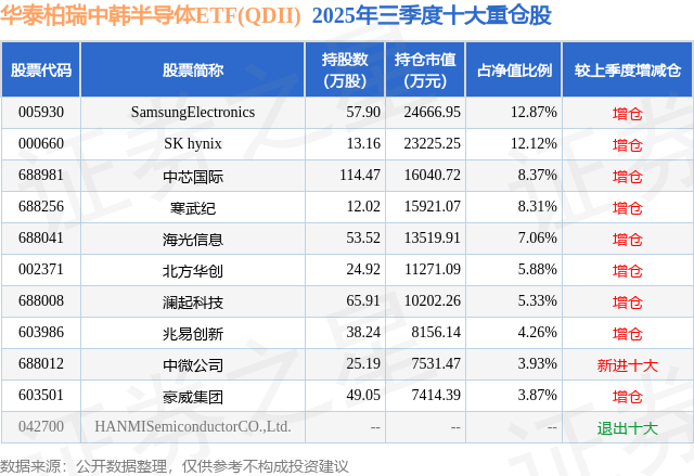 证券之星消息,日前华泰柏瑞中韩半导体ETF(QDII)基金公布三季报,2025年三季度最新规模19.16亿元,季度净值涨幅为37.65%。