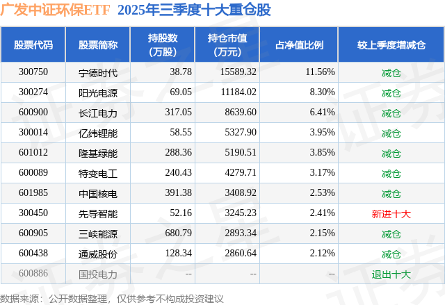 从基金规模来看,广发中证环保ETF基金2025年三季度公布的基金规模为13.48亿元,较上一期规模11.88亿元变化了1.6亿元,环比变化了13.45%。该基金最新一期资产配置为:股票占净值比99.63%,无债券类资产,现金占净值比0.51%。从基金持仓来看,该基金当季前十大股票仓位达46.45%,第一大重仓股为宁德时代(300750),持仓占比为11.56%。
