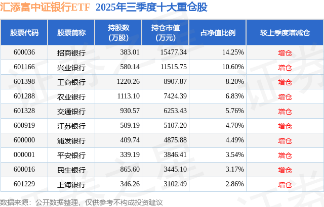 从基金规模来看,汇添富中证银行ETF基金2025年三季度公布的基金规模为10.86亿元,较上一期规模9.48亿元变化了1.38亿元,环比变化了14.54%。该基金最新一期资产配置为:股票占净值比99.72%,无债券类资产,现金占净值比0.34%。从基金持仓来看,该基金当季前十大股票仓位达64.4%,第一大重仓股为招商银行(600036),持仓占比为14.25%。