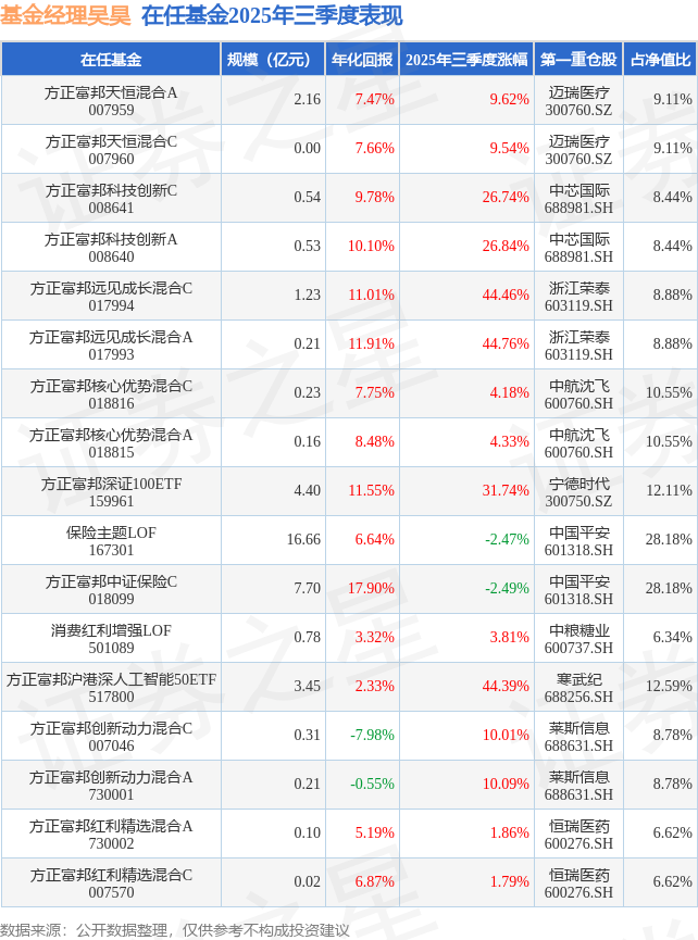 从基金规模来看,方正富邦深证100ETF基金2025年三季度公布的基金规模为4.4亿元,较上一期规模4.42亿元变化了-191.04万元,环比变化了-0.43%。该基金最新一期资产配置为:股票占净值比98.94%,无债券类资产,现金占净值比1.1%。从基金持仓来看,该基金当季前十大股票仓位达42.31%,第一大重仓股为宁德时代(300750),持仓占比为12.11%。