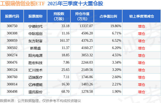 从基金规模来看,工银瑞信创业板ETF基金2025年三季度公布的基金规模为6.71亿元,较上一期规模4.38亿元变化了2.33亿元,环比变化了53.28%。该基金最新一期资产配置为:股票占净值比99.16%,无债券类资产,现金占净值比0.92%。从基金持仓来看,该基金当季前十大股票仓位达57.09%,第一大重仓股为宁德时代(300750),持仓占比为19.86%。