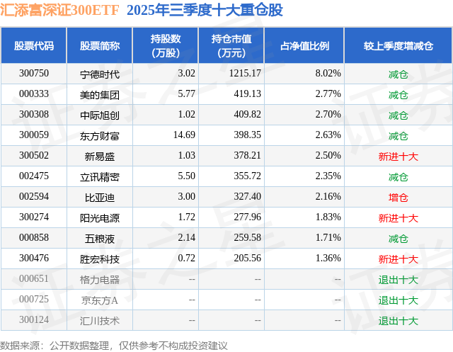 从基金规模来看,汇添富深证300ETF基金2025年三季度公布的基金规模为1.52亿元,较上一期规模1.19亿元变化了3277.49万元,环比变化了27.6%。该基金最新一期资产配置为:股票占净值比99.61%,无债券类资产,现金占净值比0.52%。从基金持仓来看,该基金当季前十大股票仓位达28.03%,第一大重仓股为宁德时代(300750),持仓占比为8.02%。