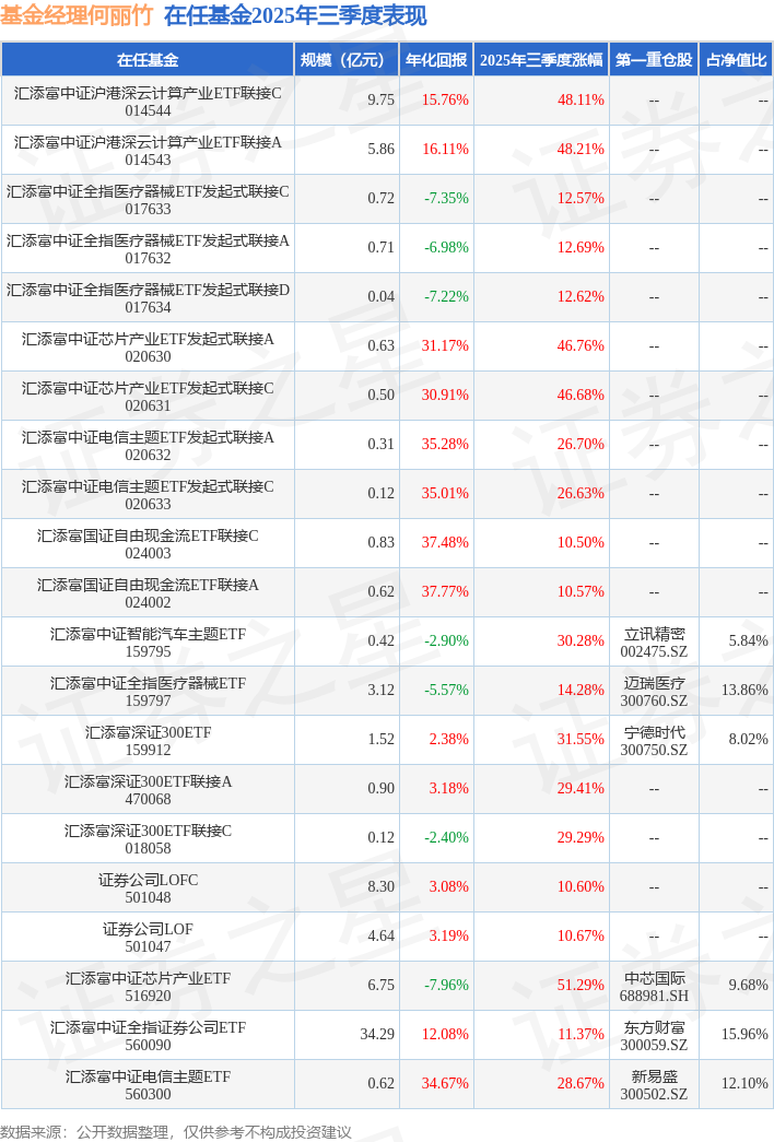 汇添富深证300ETF现任基金经理为何丽竹。其中在任基金经理何丽竹已从业0年又225天,2025年5月16日正式接手管理汇添富深证300ETF,任职期间累计回报为34.79%。目前还管理着21只基金产品(包括A类和C类),其中本季度表现最佳的基金为汇添富中证芯片产业ETF(516920),季度净值涨幅为51.29%。