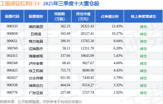 从基金规模来看,工银深证红利ETF基金2025年三季度公布的基金规模为19.6亿元,较上一期规模23.77亿元变化了-4.17亿元,环比变化了-17.53%。该基金最新一期资产配置为:股票占净值比99.21%,无债券类资产,现金占净值比0.96%。从基金持仓来看,该基金当季前十大股票仓位达62.51%,第一大重仓股为美的集团(000333),持仓占比为13.43%。