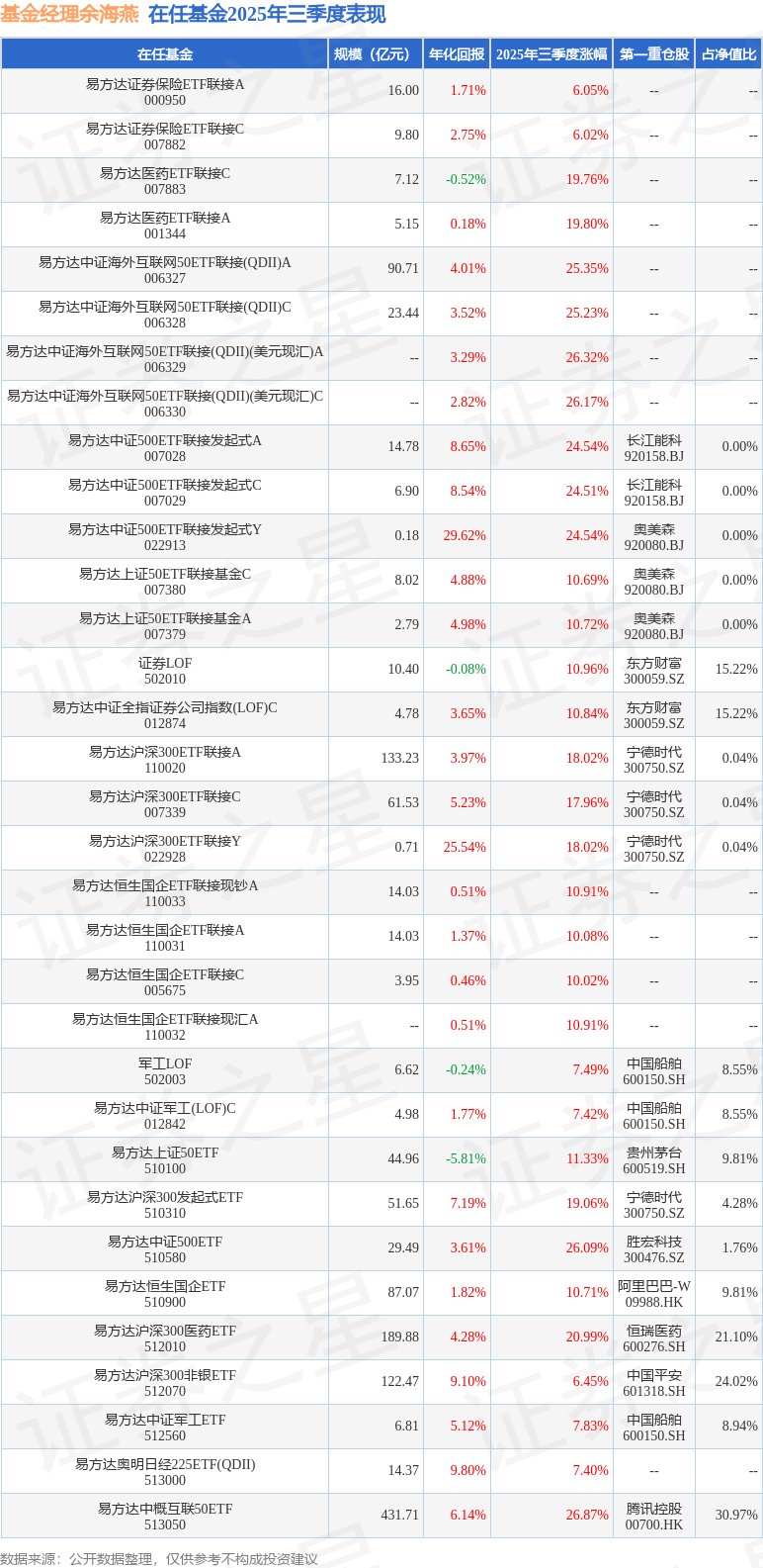易方达沪深300发起式ETF现任基金经理为余海燕 庞亚平。其中在任基金经理余海燕已从业13年又350天,2016年4月16日正式接手管理易方达沪深300发起式ETF,任职期间累计回报为80.41%。目前还管理着33只基金产品(包括A类和C类),其中本季度表现最佳的基金为易方达中概互联50ETF(513050),季度净值涨幅为26.87%。