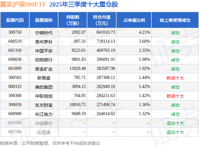 从基金规模来看,嘉实沪深300ETF基金2025年三季度公布的基金规模为996.95亿元,较上一期规模1695.71亿元变化了301.24亿元,环比变化了17.76%。该基金最新一期资产配置为:股票占净值比97.83%,无债券类资产,现金占净值比2.02%。从基金持仓来看,该基金当季前十大股票仓位达21.02%,第一大重仓股为宁德时代(300750),持仓占比为4.21%。