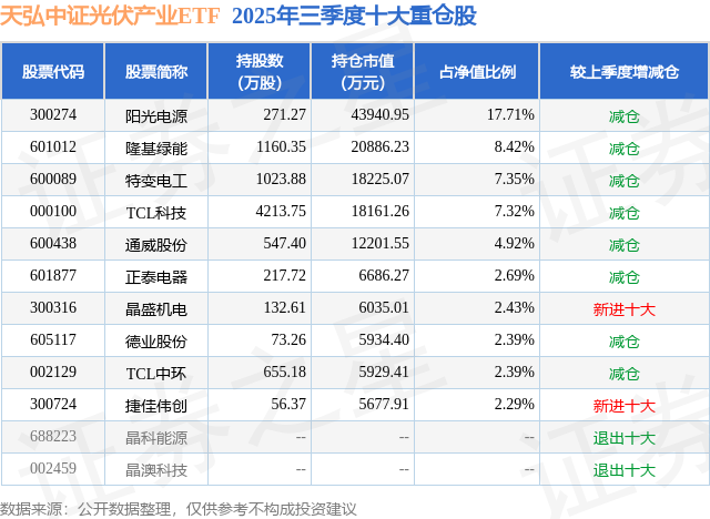 从基金规模来看,天弘中证光伏产业ETF基金2025年三季度公布的基金规模为24.81亿元,较上一期规模22.14亿元变化了2.67亿元,环比变化了12.07%。该基金最新一期资产配置为:股票占净值比99.89%,无债券类资产,现金占净值比0.77%。从基金持仓来看,该基金当季前十大股票仓位达57.91%,第一大重仓股为阳光电源(300274),持仓占比为17.71%。