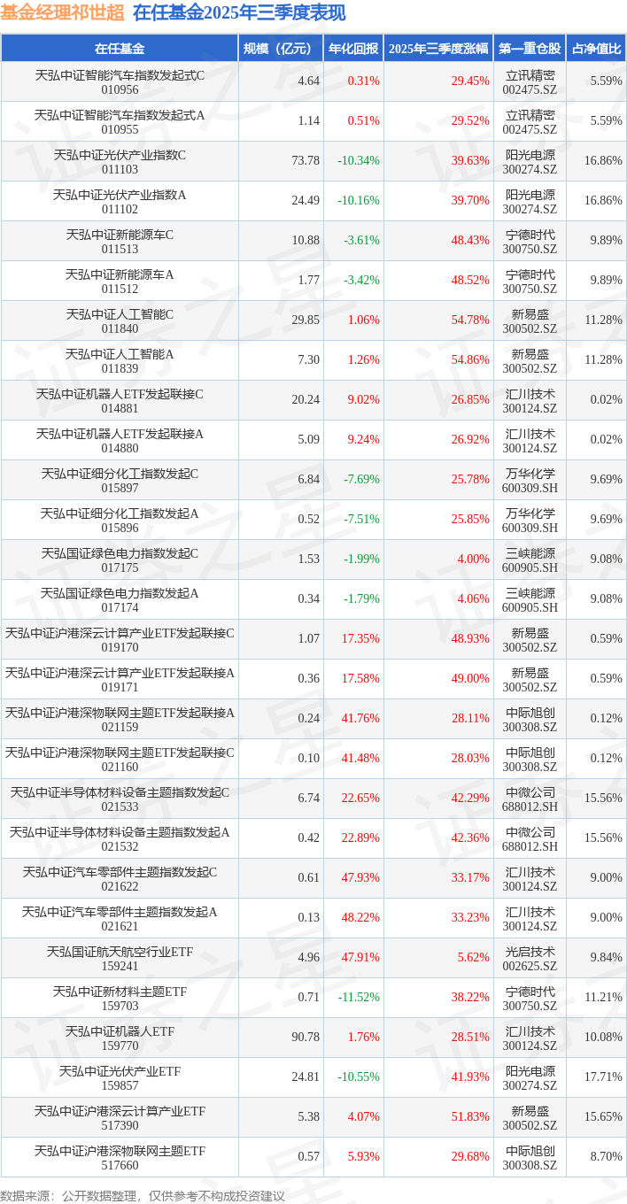 证券之星消息,日前天弘中证光伏产业ETF基金公布三季报,2025年三季度最新规模24.81亿元,季度净值涨幅为41.93%。