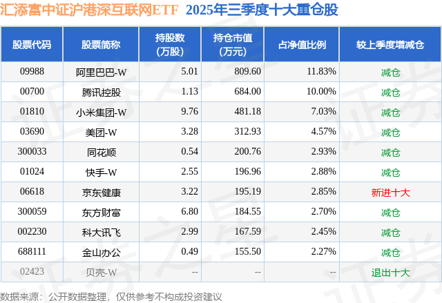 从基金规模来看,汇添富中证沪港深互联网ETF基金2025年三季度公布的基金规模为0.68亿元,较上一期规模8304.37万元变化了-1461.71万元,环比变化了-17.6%。该基金最新一期资产配置为:股票占净值比96.78%,无债券类资产,现金占净值比3.36%。从基金持仓来看,该基金当季前十大股票仓位达49.51%,第一大重仓股为阿里巴巴-W(09988),持仓占比为11.83%。