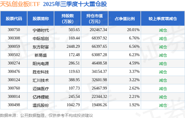从基金规模来看,天弘创业板ETF基金2025年三季度公布的基金规模为101.2亿元,较上一期规模89.68亿元变化了11.52亿元,环比变化了12.85%。该基金最新一期资产配置为:股票占净值比99.92%,无债券类资产,现金占净值比0.13%。从基金持仓来看,该基金当季前十大股票仓位达57.49%,第一大重仓股为宁德时代(300750),持仓占比为20.01%。