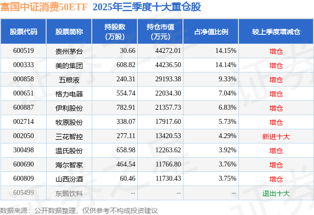 从基金规模来看,富国中证消费50ETF基金2025年三季度公布的基金规模为31.28亿元,较上一期规模21.83亿元变化了9.44亿元,环比变化了43.26%。该基金最新一期资产配置为:股票占净值比99.72%,无债券类资产,现金占净值比0.34%。从基金持仓来看,该基金当季前十大股票仓位达72.94%,第一大重仓股为贵州茅台(600519),持仓占比为14.15%。